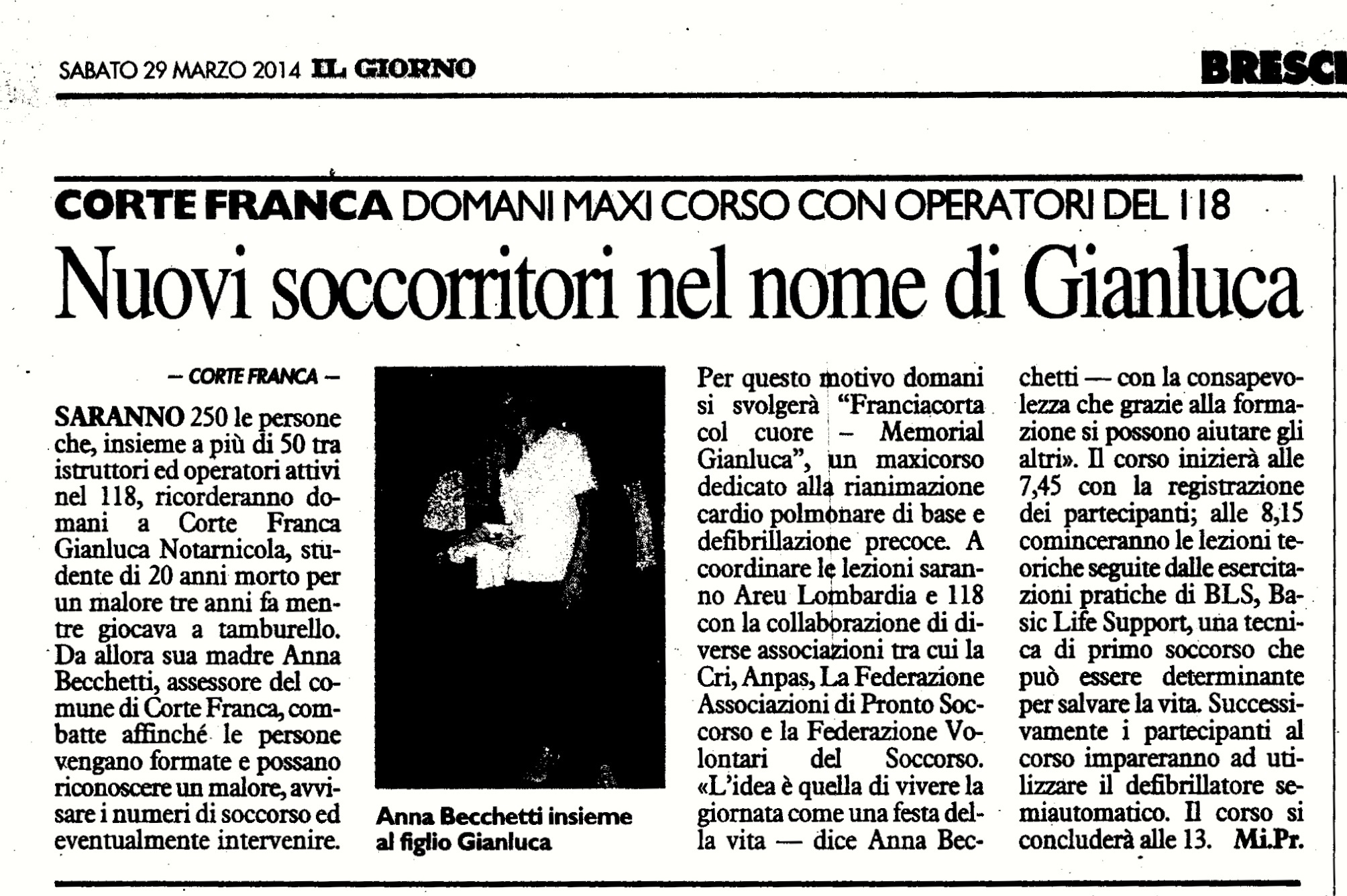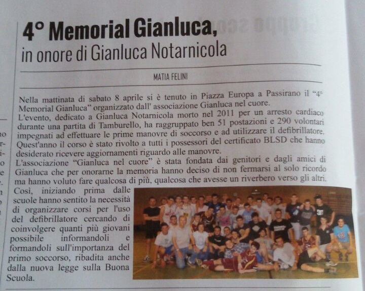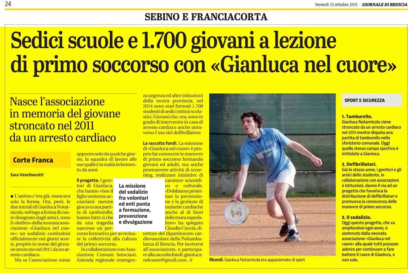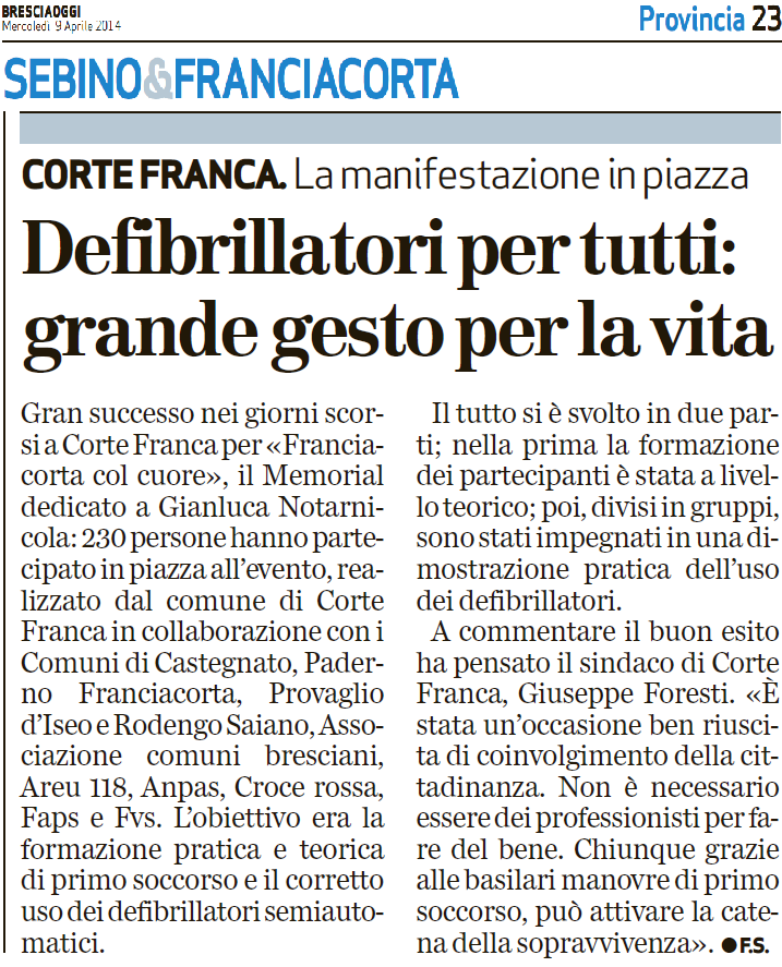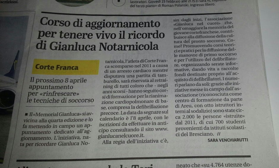 «Ottanta postazioni con altrettanti istruttori e 400 nuovi volontari in grado effettuare le prime manovre di soccorso e di utilizzare il defibrillatore». Sono questi i numeri di «Gianluca nel cuore» snocciolati da Salvatore Compatti (responsabile progetti per i defibrillatori) durante la manifestazione dedicata alla memoria di Gianluca Notarnicola di Corte Franca, morto nel 2011 a vent’anni per un arresto cardiaco durante una partita di tamburello.