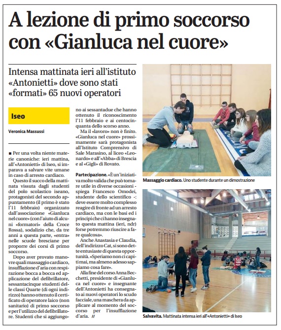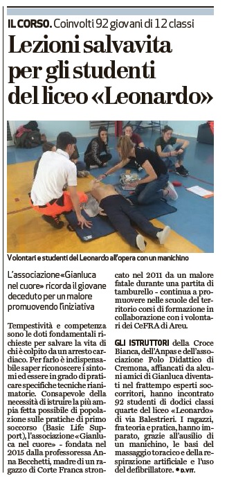 All’invito di Areu ha risposto anche il liceo Leonardo con l’iniziativa «Leo nel cuore»: un’intera classe, la 3ªO, ha partecipato, lo scorso venerdì, ad una lezione di primo soccorso incentrata sul corretto utilizzo del defibrillatore.