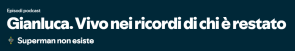 - Un podcast dedicato a Gianluca“Gianluca. Vivo nei ricordi di chi è restato”. Ecco la puntata del podcast “Superman non esiste” dedicata a Gianluca. All’interno troverete le interviste ai genitori di Gianluca e ai nostri istruttori Luca e Nicola.